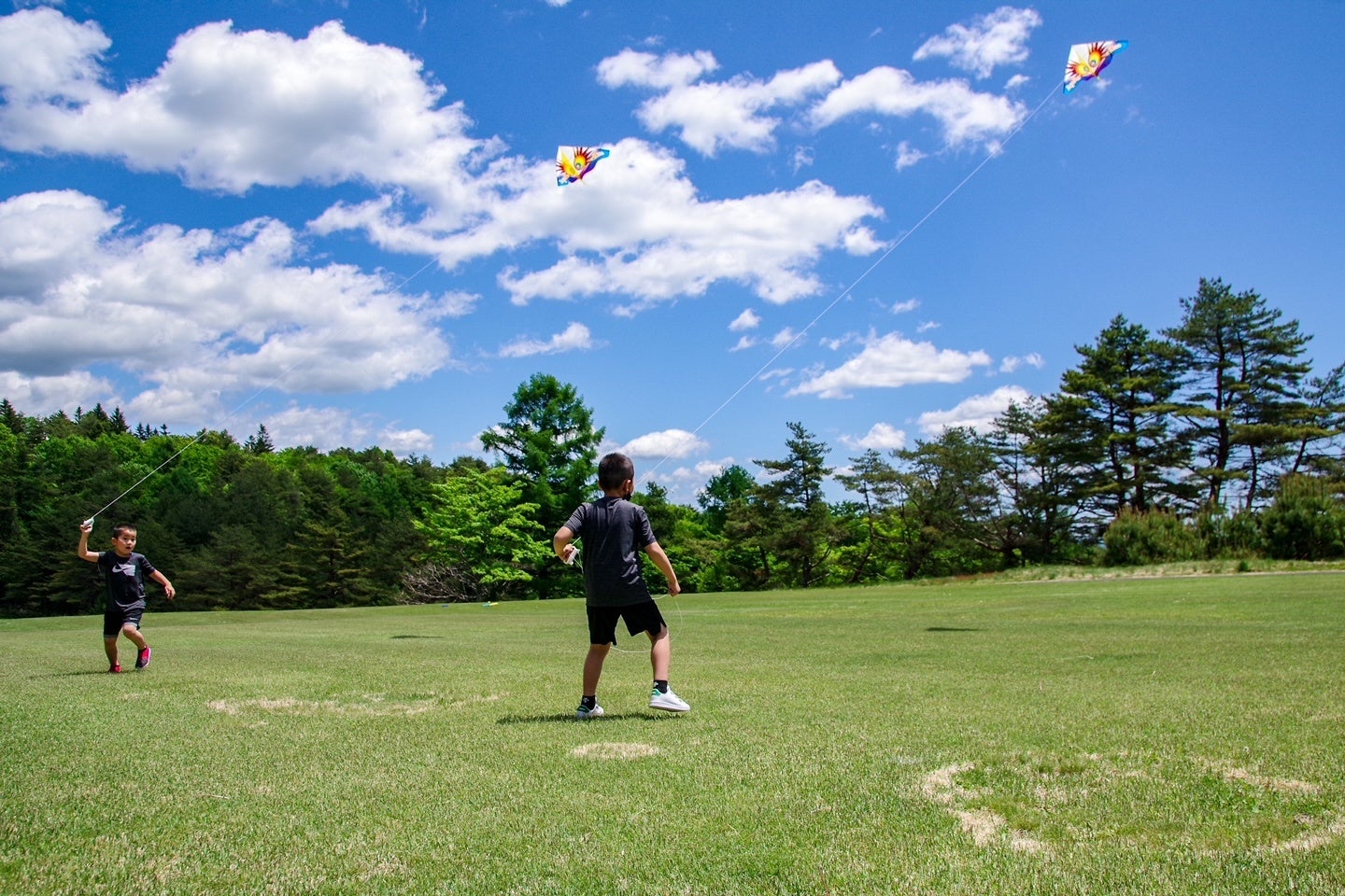 が手掛けたグラスガーデン(芝生の広場)は格別です。標高1,100mの高原だから吹く風もカラッと心地よくサッカーボールやバドミントンにフリスビー、おとなも童心に帰ってつい夢中になる凧揚げなど遊具も無料でお貸し出ししております。