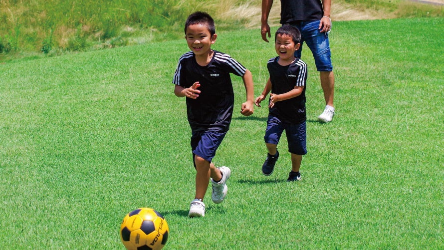 芝生の上で走って転んで寝そべって。併設するゴルフ場のプロたち