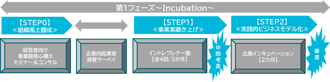 企業内起業家(イントレプレナー)の養成を通じて、各社における新規事業開発を成功に導くための道筋(パス)となることを目的とした『イントレパス』事業は、5つのステップからなる新規事業開発ステージゲートを2つのフェーズに分けて、サポートプログラムを用意します。