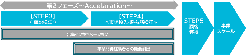 実践的ビジネスモデルに至った新規事業計画をスケールさせるために必要な組織づくり、機会づくり、販売・ブランディング戦略策定を行い、市場投入後の勝ち筋の検証まで進めていくプログラムです。
