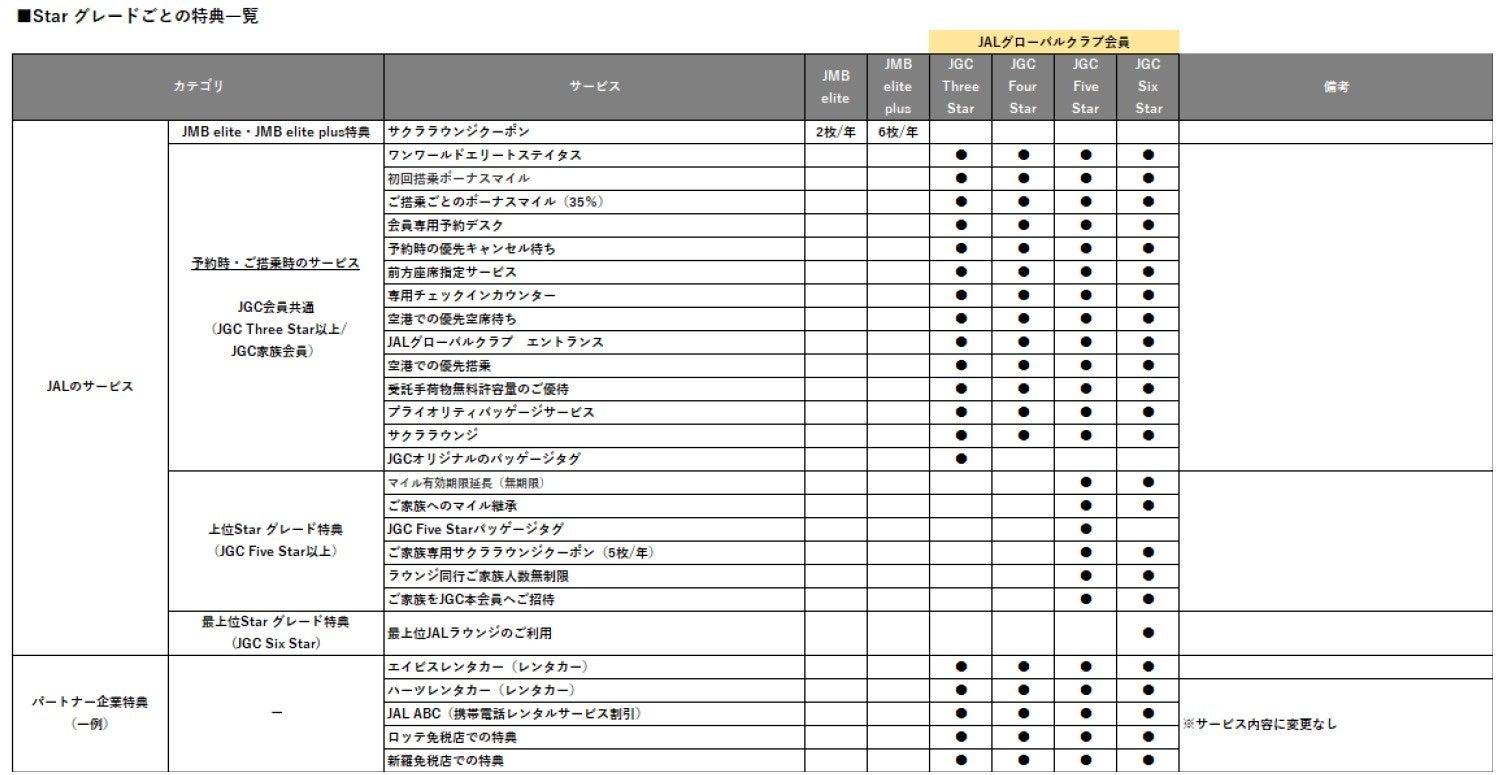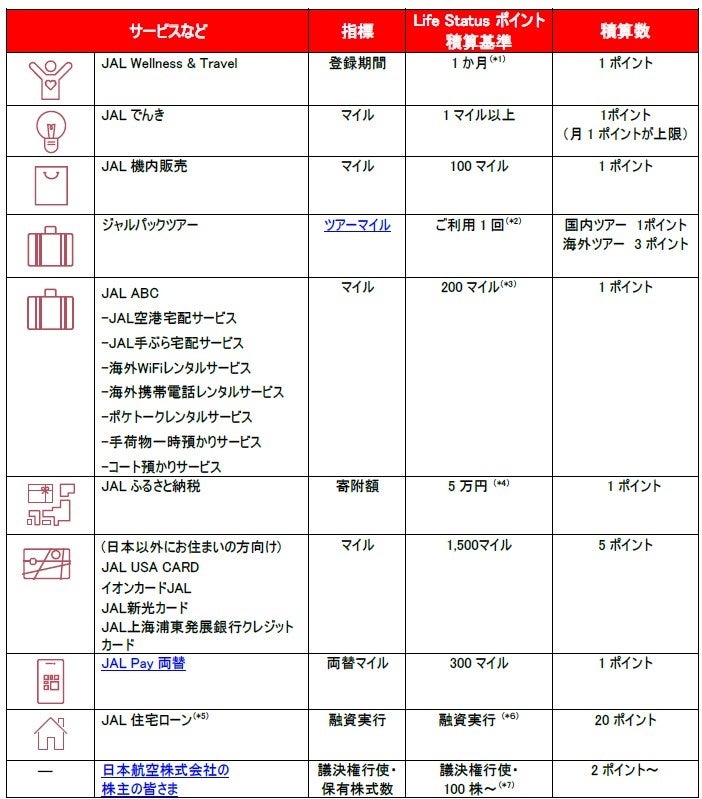 (*)JAL Life Status プログラムは、対象サービスのご利用実績に応じて積算される生涯実績ポイントである「Life Status ポイント」の総保有数に応じ「JALグローバルクラブへの入会資格」や「Star グレード」をご提供するプログラムです。「Life Status ポイント」はマイルとは異なり、特典交換などにはご利用いただけません。