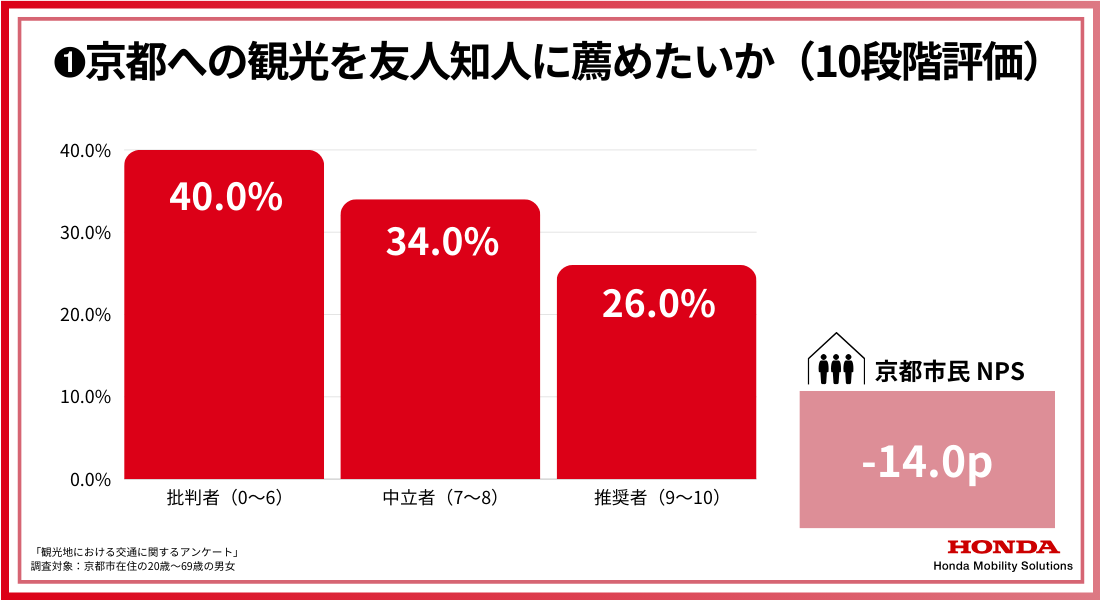 京都市民に対し、“観光地としての京都”に関するロイヤリティを計る手法として、NPS(ネット・プロモーター・スコア ※1)を行ったところ、結果は「-14.0ポイント」でした。
