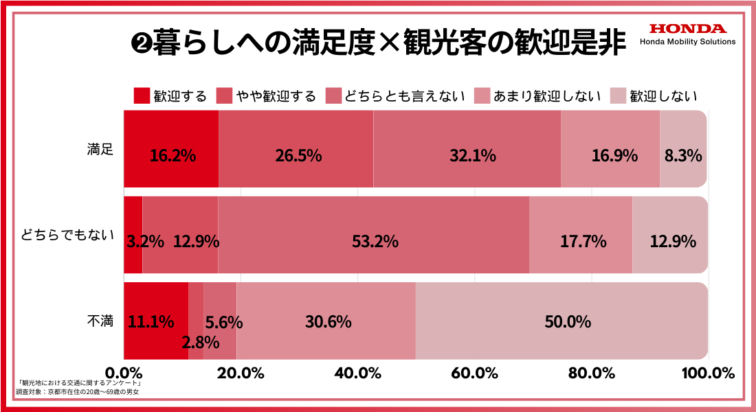 また、京都で暮らすことへの満足度と観光客の歓迎是非についてクロス集計をしてみると、暮らしへの満足度が高い人ほど観光客を歓迎し、不満を抱えている人ほど観光客を歓迎していないことが分かりました。地元住民にとって、観光客が生活の満足度にも影響している可能性を示唆することができます。