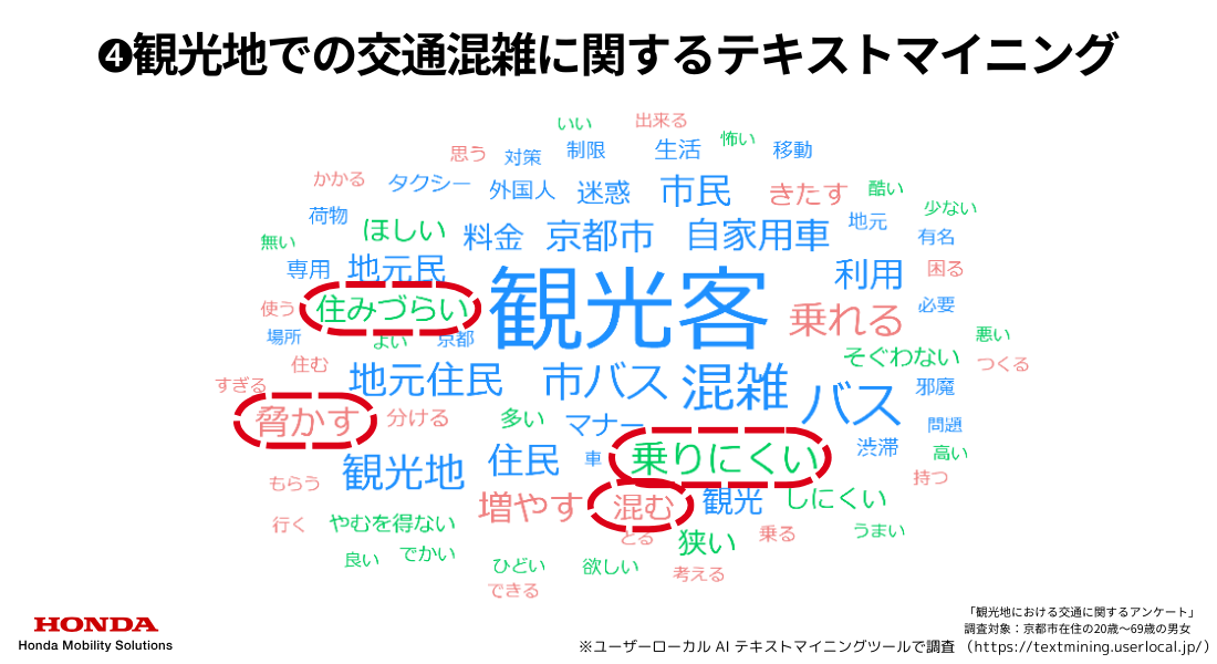 「住みづらい」「乗りにくい」「混む」というネガティブなキーワードが多くあり、また「住民」「地元住民」など京都市民の主語も目立ちます。京都市民が、観光客へ交通に関してネガティブなイメージを抱いていることが推察できます。一方で、「増やす」「つくる」などの改善に繋がるキーワードも見えることから、観光客と地元民の双方が、快適に移動ができる方法を模索していきたい考えも垣間見えます。