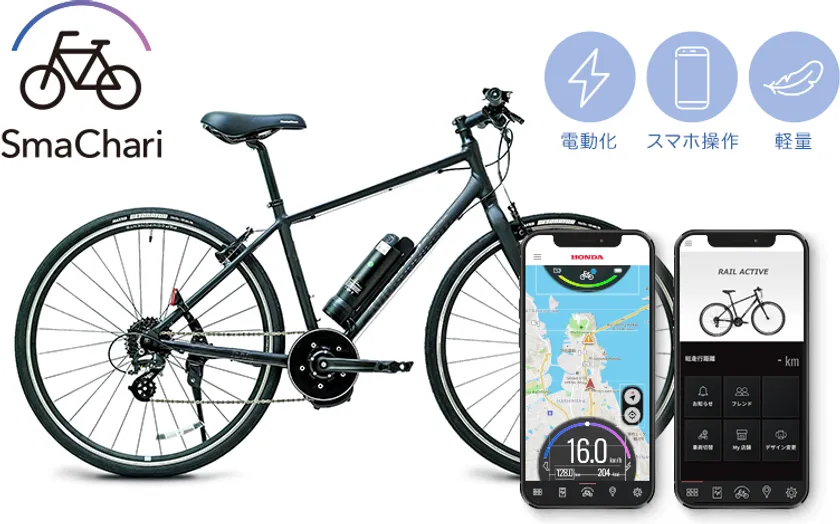 「RAIL ACTIVE-e」は、Hondaが2023年3月に発表した、自転車に取り付ける電動アシストユニットと、それに連動するスマートフォンアプリによりさまざまな自転車を電動アシスト化・コネクテッド化できるサービス「SmaChari」を世界で初めて搭載した最先端の電動アシスト自転車です。スマートフォンアプリを通じて、速度など走行状態やバッテリー残量の表示、走行データ管理など、さまざまな機能・情報を利用できます。なお、一般的なe-Bikeよりも軽量、かつお求めやすい価格で、通勤通学などに使いやすいのも魅力です。