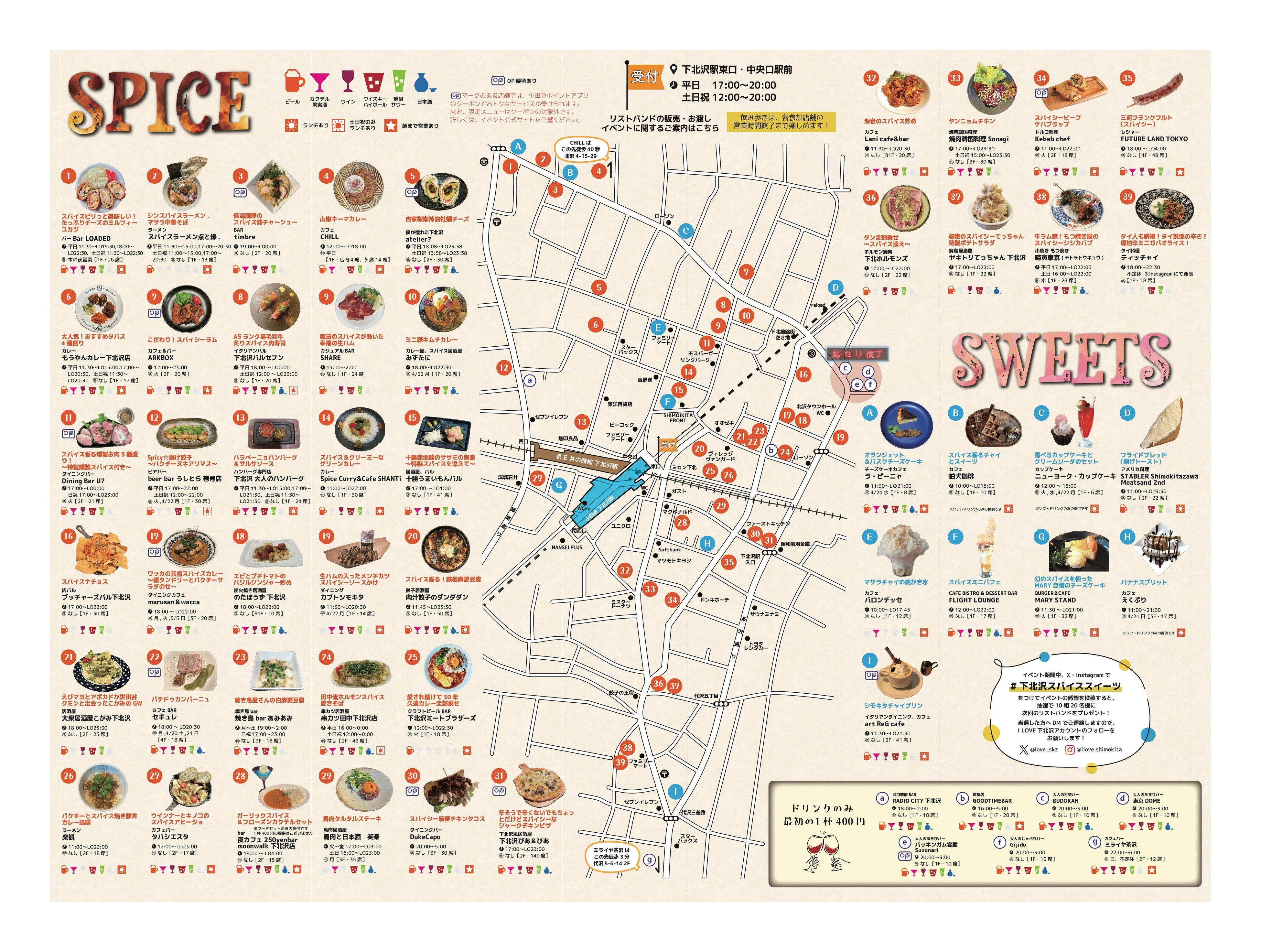 本イベントは、下北沢のディープな飲食店を探訪できる街ぐるみの飲み歩きイベントです。これまで5万人以上が参加し、19回目を迎える今回は大人気の「スパイス料理」と「スイーツ」を組み合わせて開催いたします。