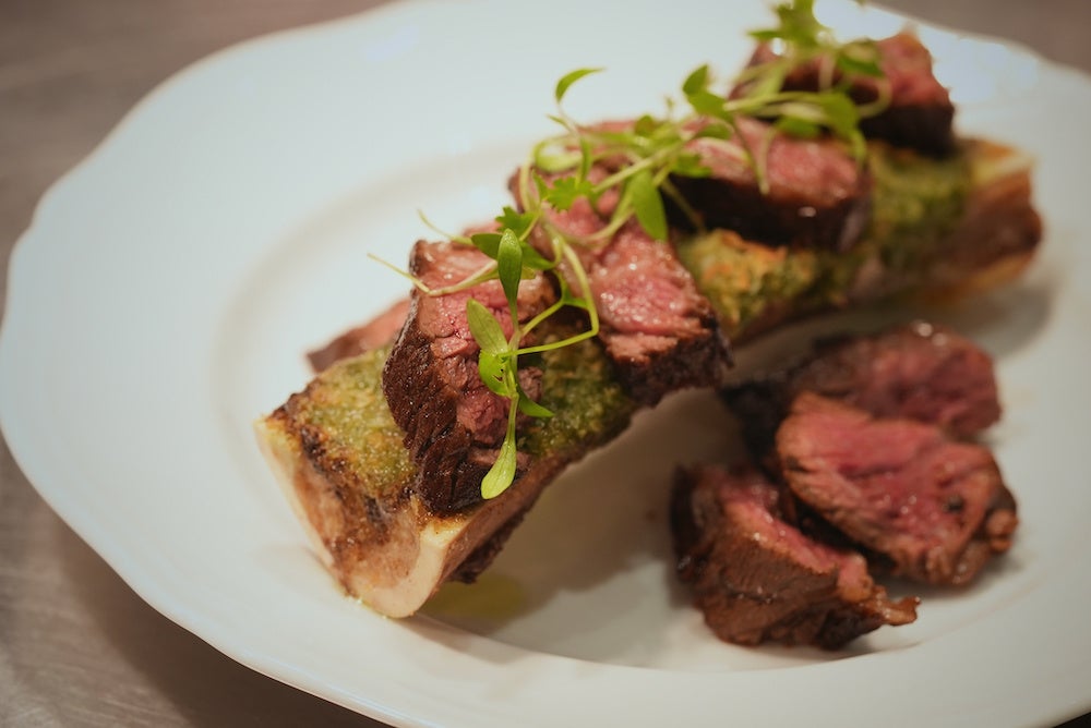 広島県福山市にあるなかやま牧場様から届く神石和牛は、広大な敷地でのびのびと育った和牛。そのバベット(※牛ヒレ肉に付いているバラ肉の一部)を強火で火入れし、ボーンマローのハーブバター焼きを添えました。メインに食べていただきたい一皿です。