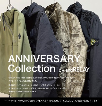 ブランドリユースをメインビジネスとしている当社においても、自然共生型ライフスタイルを促進したいという思いに共感し、「GREEN AGE」のオープンと同時にリレーユース(※)のコンセプトショップである「andRELAY」をオープン。サステナブルな背景を持つアイテムやアウトドアファッションアイテムなどの販売、常設のカウンターで買取業務を行ってきました。