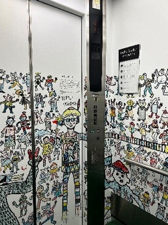 ITOCHU SDGs STUDIO(東京都港区北青山2-3-1 Itochu Garden内)では、昨年12月に開催した「異彩の軌跡展 with ヘラルボニー」展で作家・笠原鉄平氏がライブペインティングで制作したアート作品「みなでピース」が、2024 年 3 月 26 日(火)より当施設エレベーターにラッピングされることになりました。