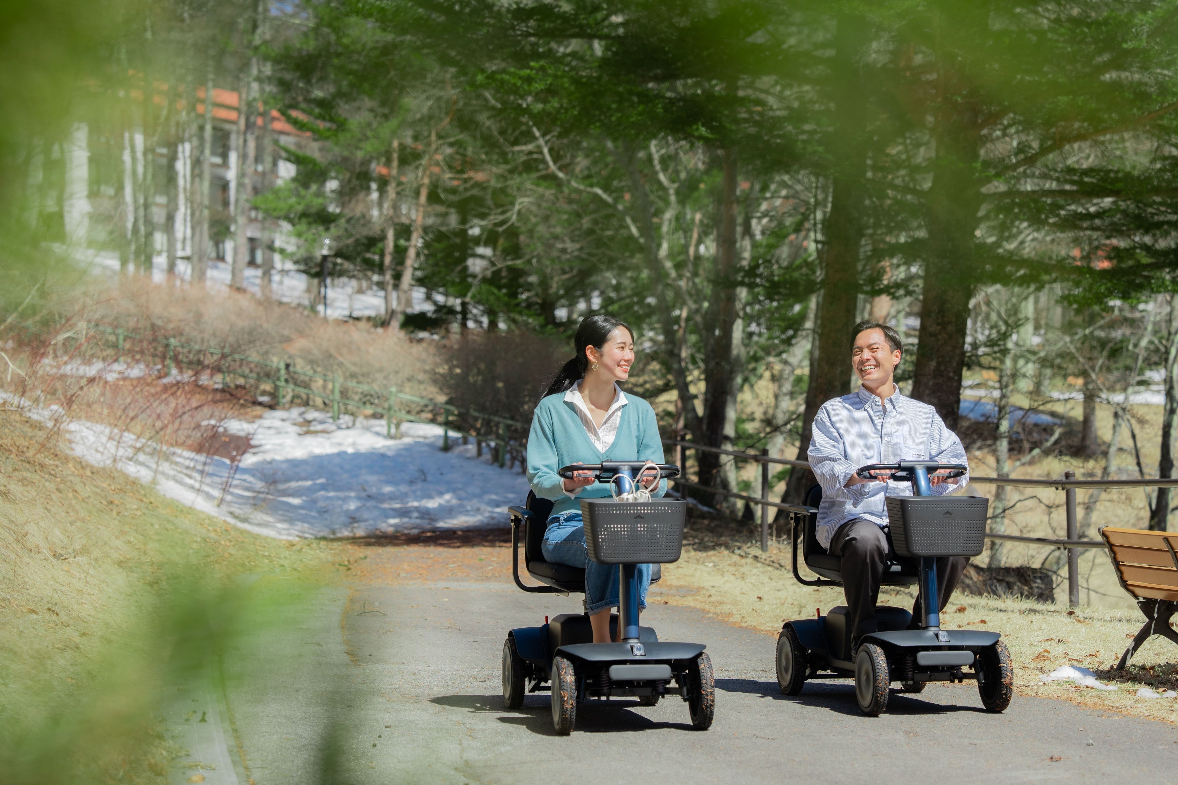 ホテルがある「東急リゾートタウン蓼科」は、およそ 660 haの広大な敷地の一部が国定公園に指定されており、豊富な生物多様性が守られた環境の中、自然散策や森林浴が楽しめます。4 輪でハンドルがついたスクータータイプの「WHILL」は、安定して長く走行できることが特徴で、自然の地形を生かし起伏に富んだタウン内で歩くことや体力に自信のない方でも、ホテルフロントで気軽にレンタルしご利用いだけます。