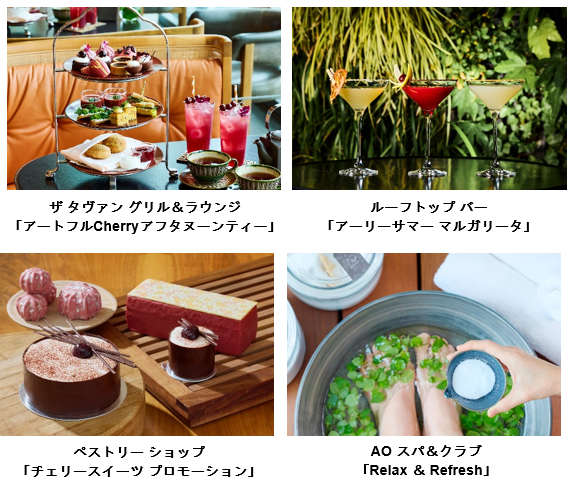 『ザ タヴァン グリル&ラウンジ』では、初夏に旬を迎える爽やかな甘さのチェリーを贅沢に使用した「アートフルCherryアフタヌーンティー」を、『ルーフトップ バー』では、晩柑やトマトなどを使った、初夏を感じるユニークな3種類のマルガリータを期間限定にてご提供いたします。『ペストリー ショップ』では、暑さ疲れを癒す旬のチェリーを贅沢に使用したスイーツをご用意しました。また、『AO スパ&クラブ』では、清涼感や爽快感へと導く効果のあるミントを使用し、心と体のリラックスやリフレッシュを促す期間限定トリートメント「Relax & Refresh」をご用意し、皆さまをお迎えいたします。