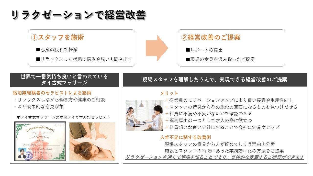 従業員のリラクゼーションによる心身の健康促進と、現場からの真の声を活かした旅館業の働き方改革と利益向上の支援を実現します。