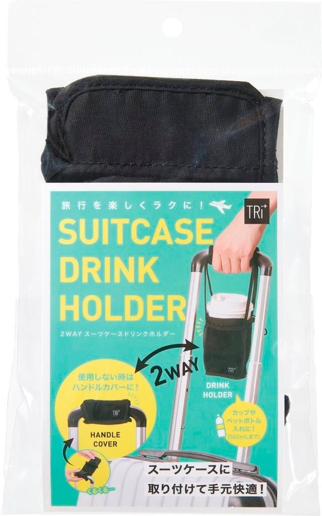 ドリンクカップがぴったり収まる設計で、スーツケースを斜めにしても水平を保たれてこぼれにくく、巻きつける裏面には滑り止め付で安心仕様。口を絞れるドローコード付き。カップやペットボトル入れに!(500mLまで)使用しない時はハンドルカバーに!