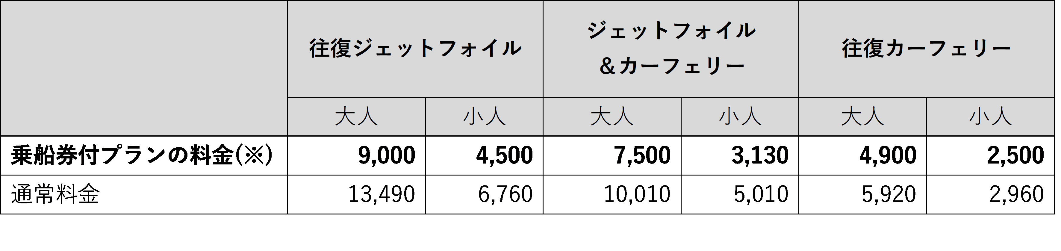 乗船券付きプラン料金表(乗船券のみ)