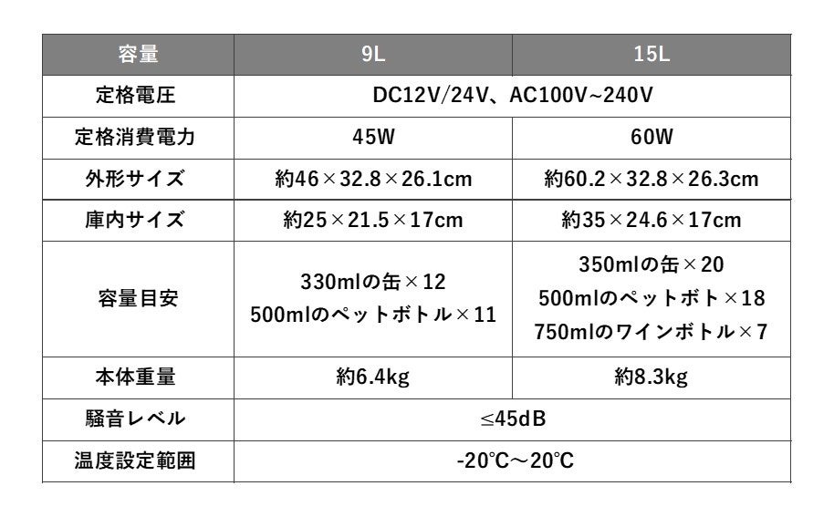 「BougeRV CR Lite ポータブル冷蔵庫」は便利な9Lと15Lの容量を提供し、330mlの缶12本/500mlのペットボトル11本(9L)、または330mlの缶20本/500mlのペットボトル18本/750mlのワインボトル7本(15L)収めることができます。