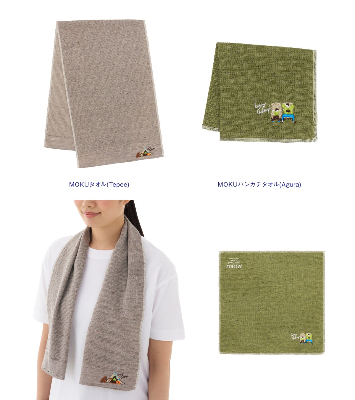 愛媛県今治市発のMOKUとのコラボレーションした高品質タオル、ハンカチタオルとのセットもご用意。薄くて軽いだけでなく、片側がパイル素材のため吸水力にも優れる。綿100%であることに加え今治の熟練工が丁寧に不純物を落としているので高い吸水力を誇る。