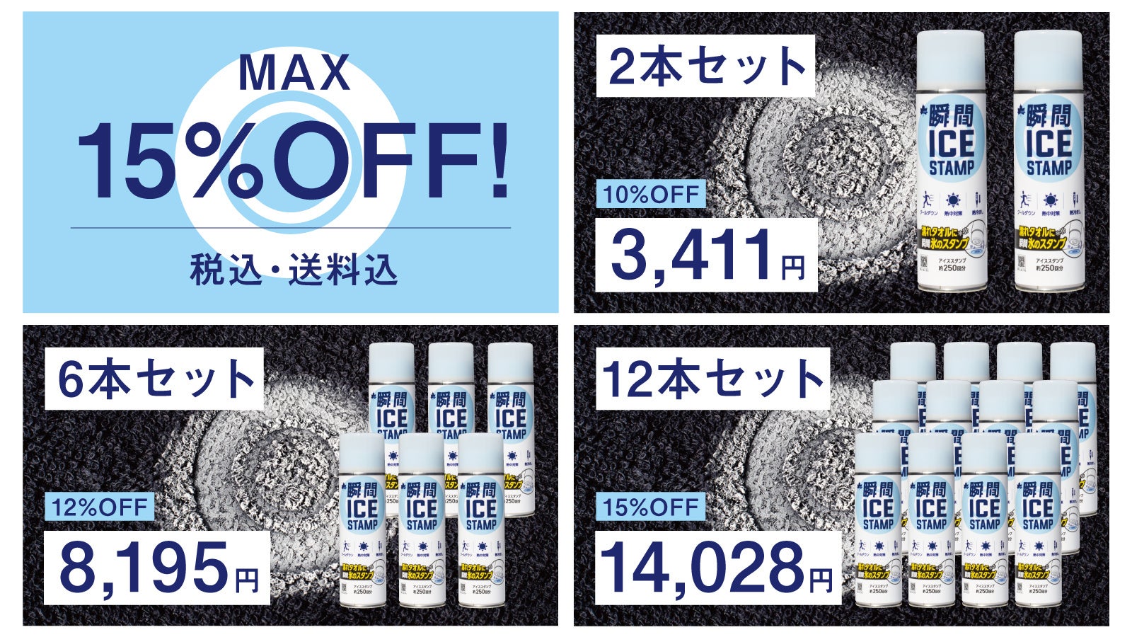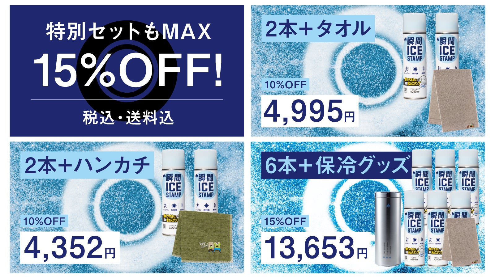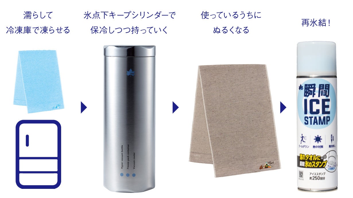 また、瞬間アイススタンプをより便利にご使用いただけるセットもご用意しました。愛媛県今治市発のMOKUとコラボレーションした高品質タオル、ハンカチタオルとのセットに加え、「氷点下キープシリンダー」とのセットもラインアップします。