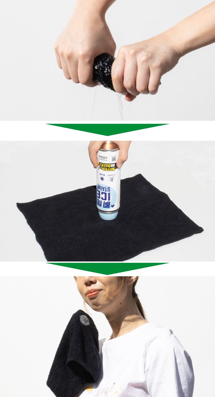 使い方は簡単3ステップです。まずタオルやハンカチ等を水で濡らします。次に本体を逆さまにし、スタンプを直接当て1秒~3秒間プッシュします。最後に冷やしたい箇所にアイシング、クールダウンしてください。折りたたんでスタンプすると複数個所を凍結できます。