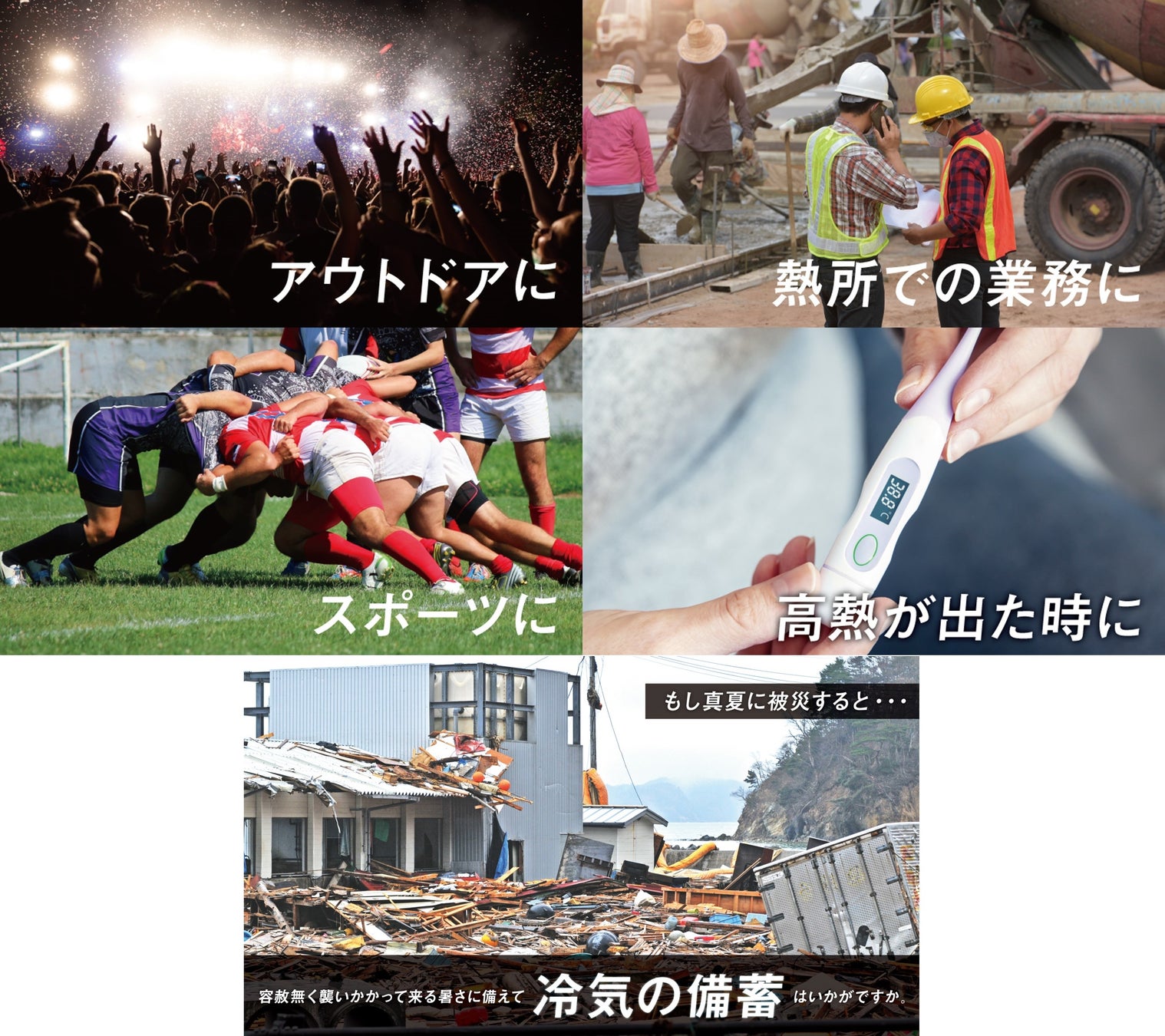 真夏のアウトドアシーンはもちろん、熱所での作業やスポーツ、高熱が出た際の熱さましとしてもご使用いただくことができるだけでなく、長期間常温で備蓄できる真夏の防災グッズとしても活躍します。