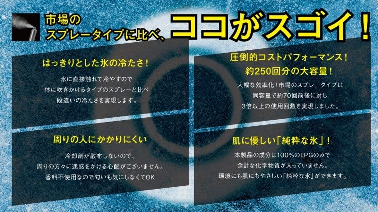 スプレータイプの冷却剤と比較すると、「LOGOS 瞬間アイススタンプ」は密着して1点集中凍結のため、冷却効率が高いことが特徴。また、界面活性剤不使用なので環境にも肌にもやさしい。