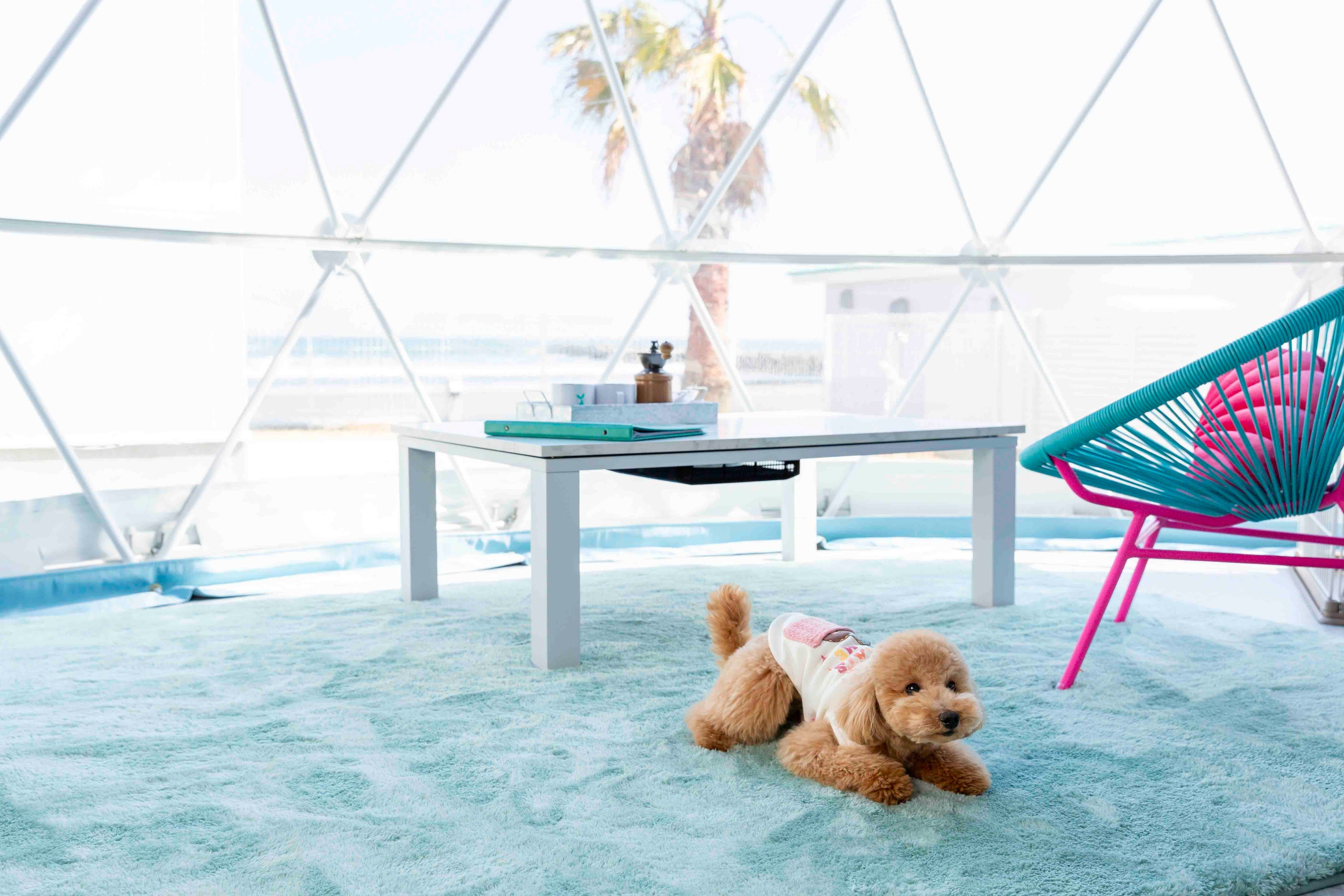 「ペットが一緒に泊まれて、ペット用品も充実」ペット同伴ドームテントでは、室内及びサイトのフェンス内でペットとリードなしに過ごすことができます。犬・猫・うさぎなどご家族同然のペットと過ごす癒しのひと時を過ごすことができます。