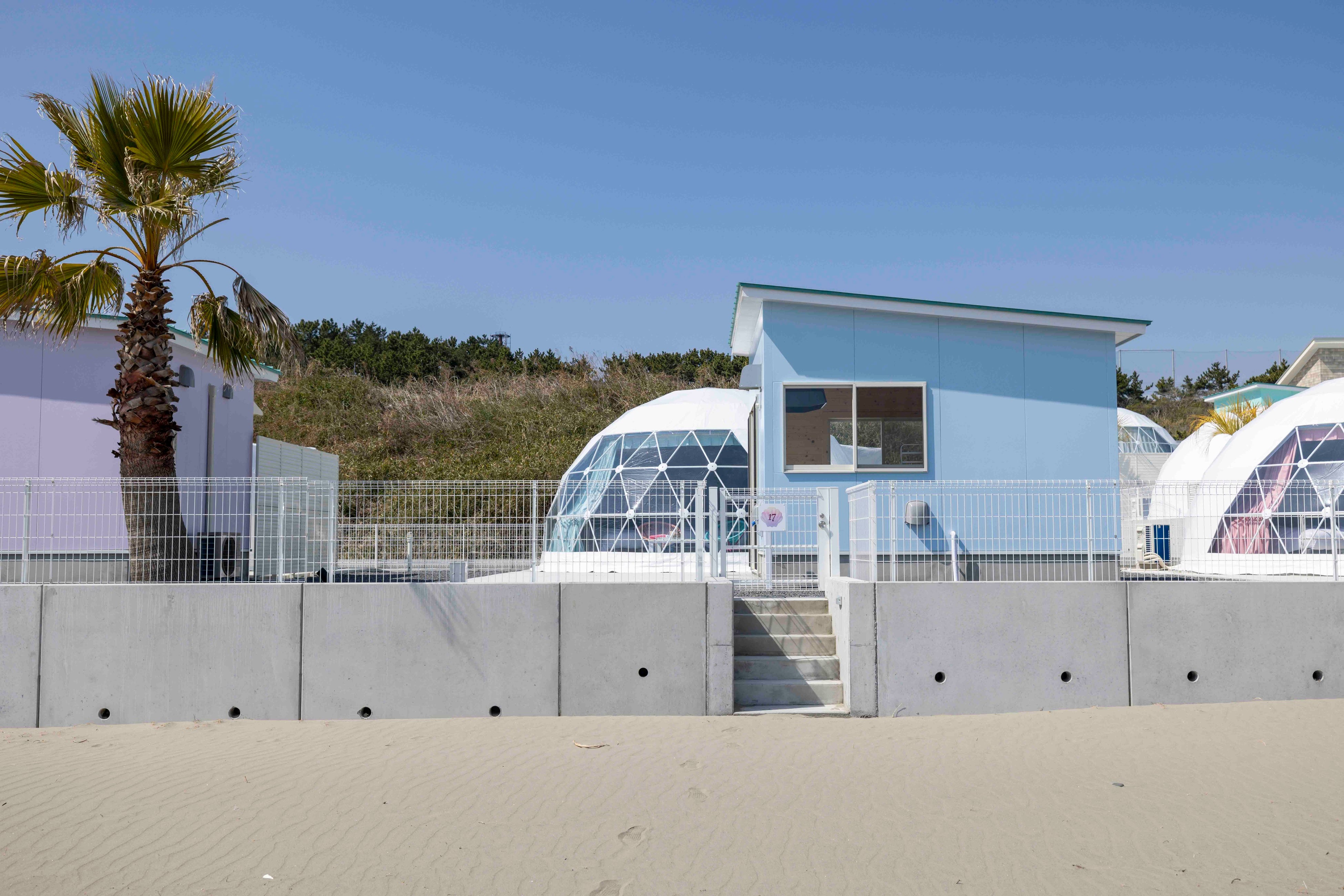全室、大洗サンビーチの絶景を眺められるオーシャンビュー。各テントタイプに【シングルベッド4台】または【ダブルベッド2台】のお部屋をご用意しています。各テントに専用スペースのBBQハウスがあり、専用シャワー・トイレも兼ね備えています。