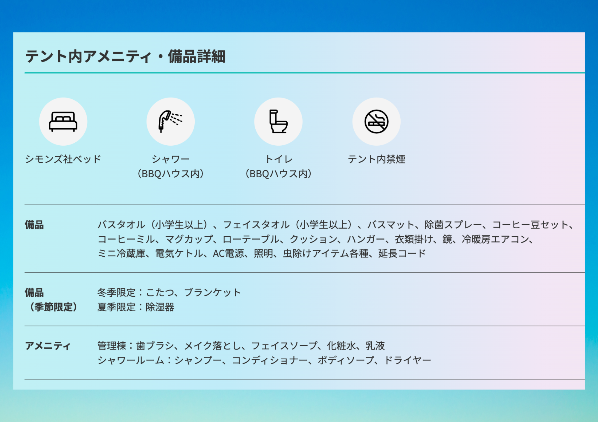 テントは直径6mのデラックスドームテントタイプで、テント内は広々としており、ファミリーでもご利用歓迎です。全室エアコンを完備しており、冬は暖かく夏は涼しく過ごすことが可能です。