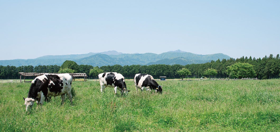 那須千本松牧場は 1893 年に那須連山のふもとで開業した、 総面積 834 ヘクタールの自然豊かな環境にある牧場です。 約 500 頭の乳牛が鳥獣保護区に指定された地域で育てられ、 牧場では「PURE MILK FARM」をコンセプトに、牛の主食と なる牧草やコーンを栽培し、堆肥をつくり、土づくり、そして牧草・コーンづくりへと循環される 「持続可能な循環型酪農」を行っています。北海道並みの飼料自給率を実現し、飼料会社から購入 する飼料も、遺伝子組換えをしていない原料に限定し、安心・安全な生乳を生産しています。
