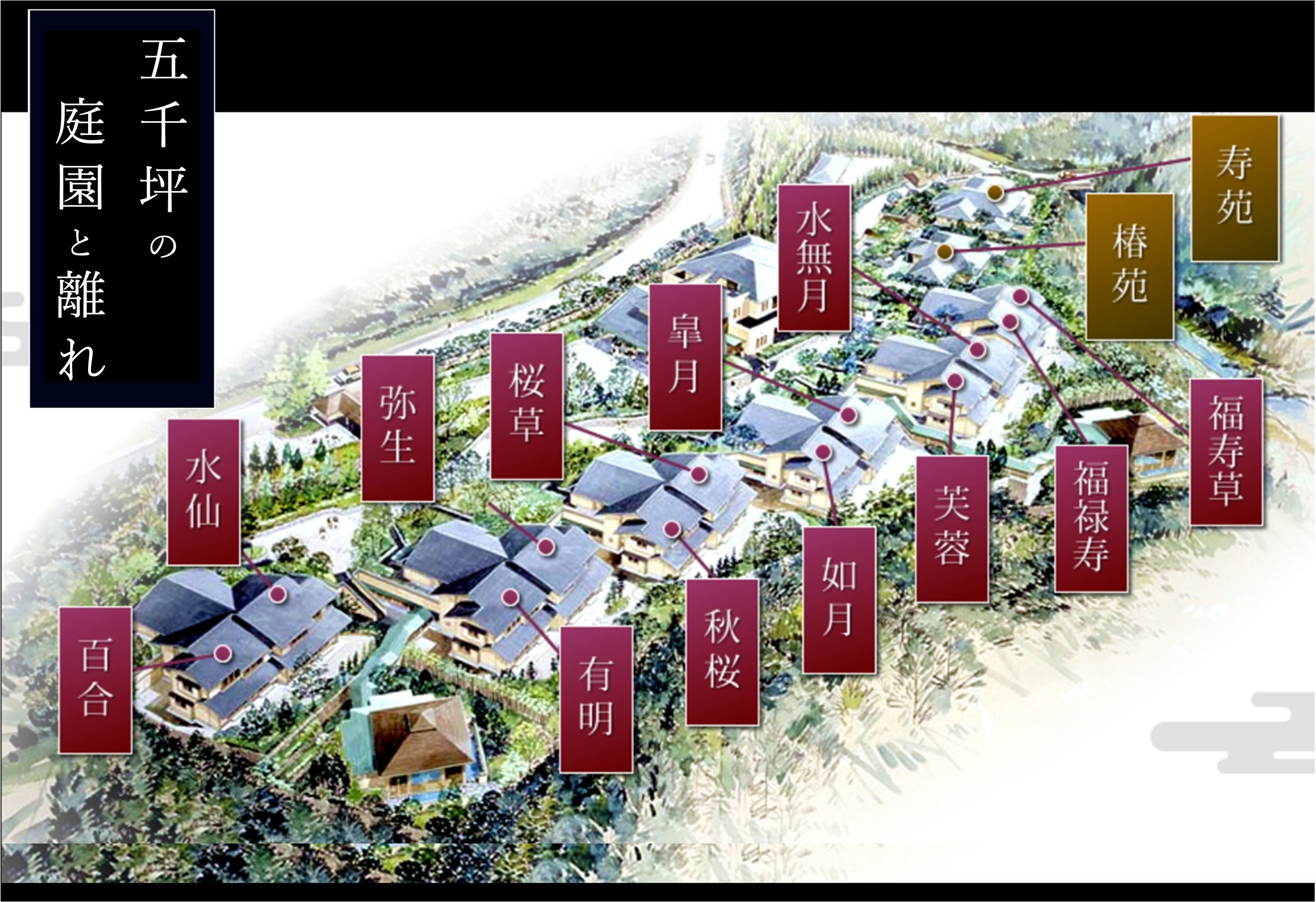 ・付帯施設:大浴場、露天風呂、サウナ、水風呂、貸切風呂、テラス、東屋、ライブラリ、ショップ、大会議室など