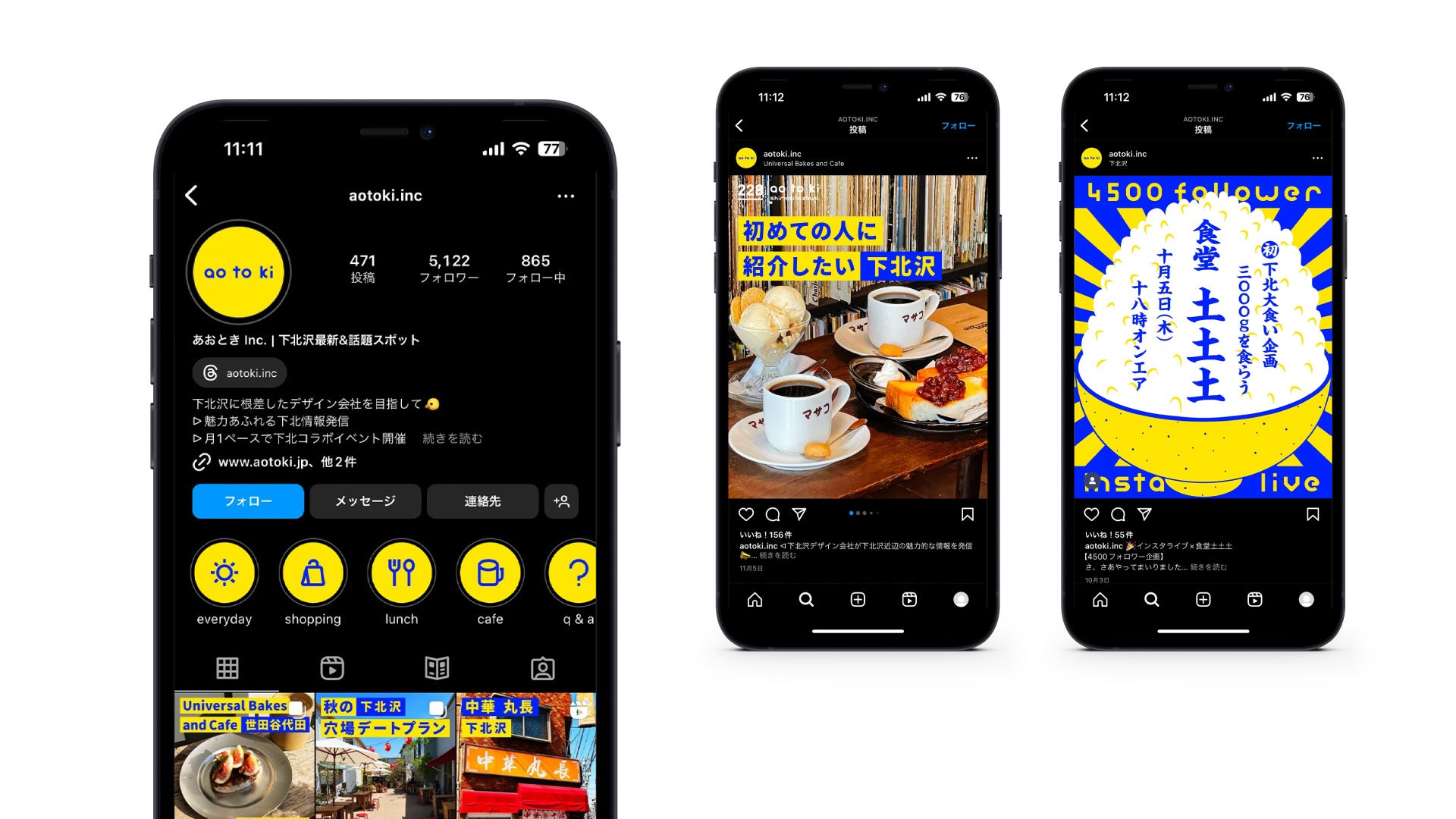 自社Instagram(https://www.instagram.com/aotoki.inc/)では、下北沢のおすすめスポットやトレンド情報を発信。約2年ほどでフォロワー5500となり、そのほとんどが下北沢と関係のある方である「質のいいアカウント」の育成に成功。