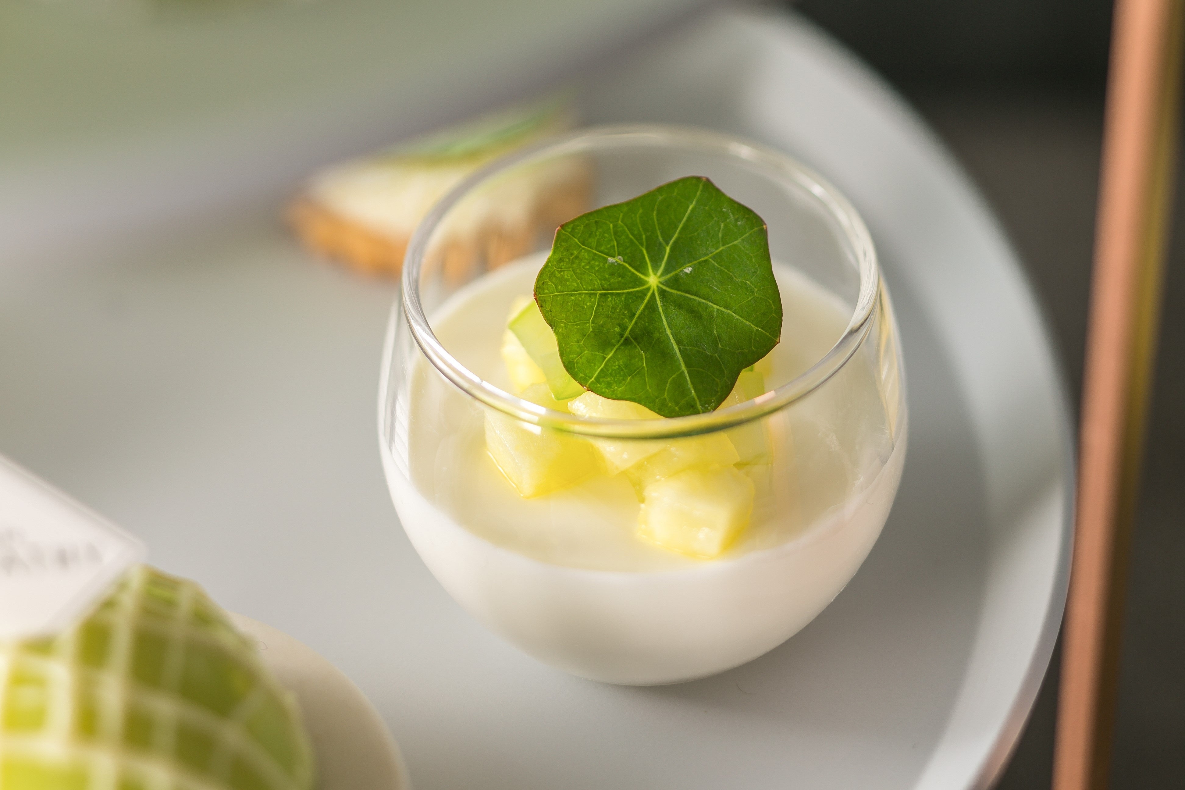 ココナッツ風味のブランマンジェ、フレッシュメロンとキウイ。