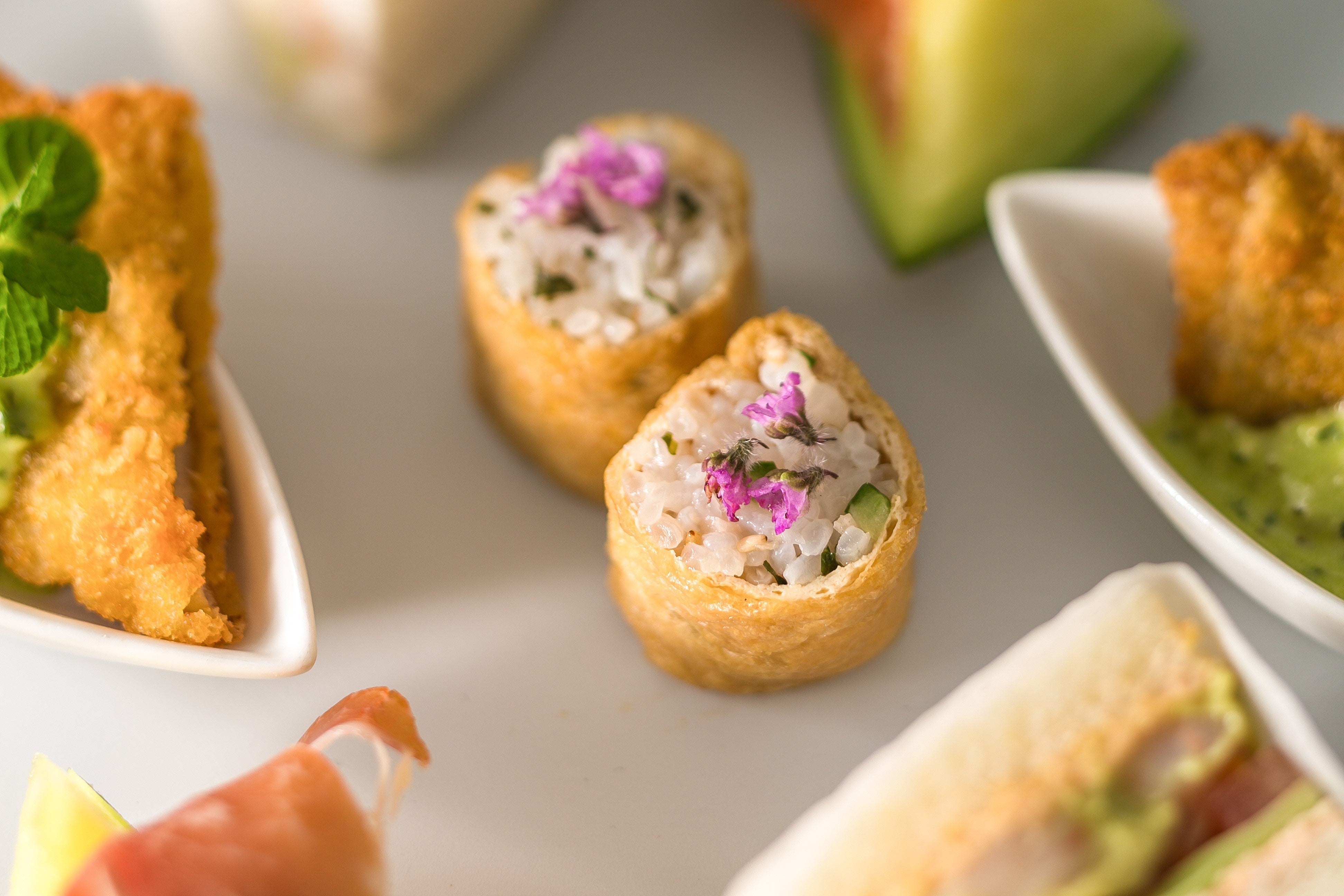 キュウリ、大葉、ゴマ、ガリの入った稲荷寿司。花穂紫蘇を添えました。