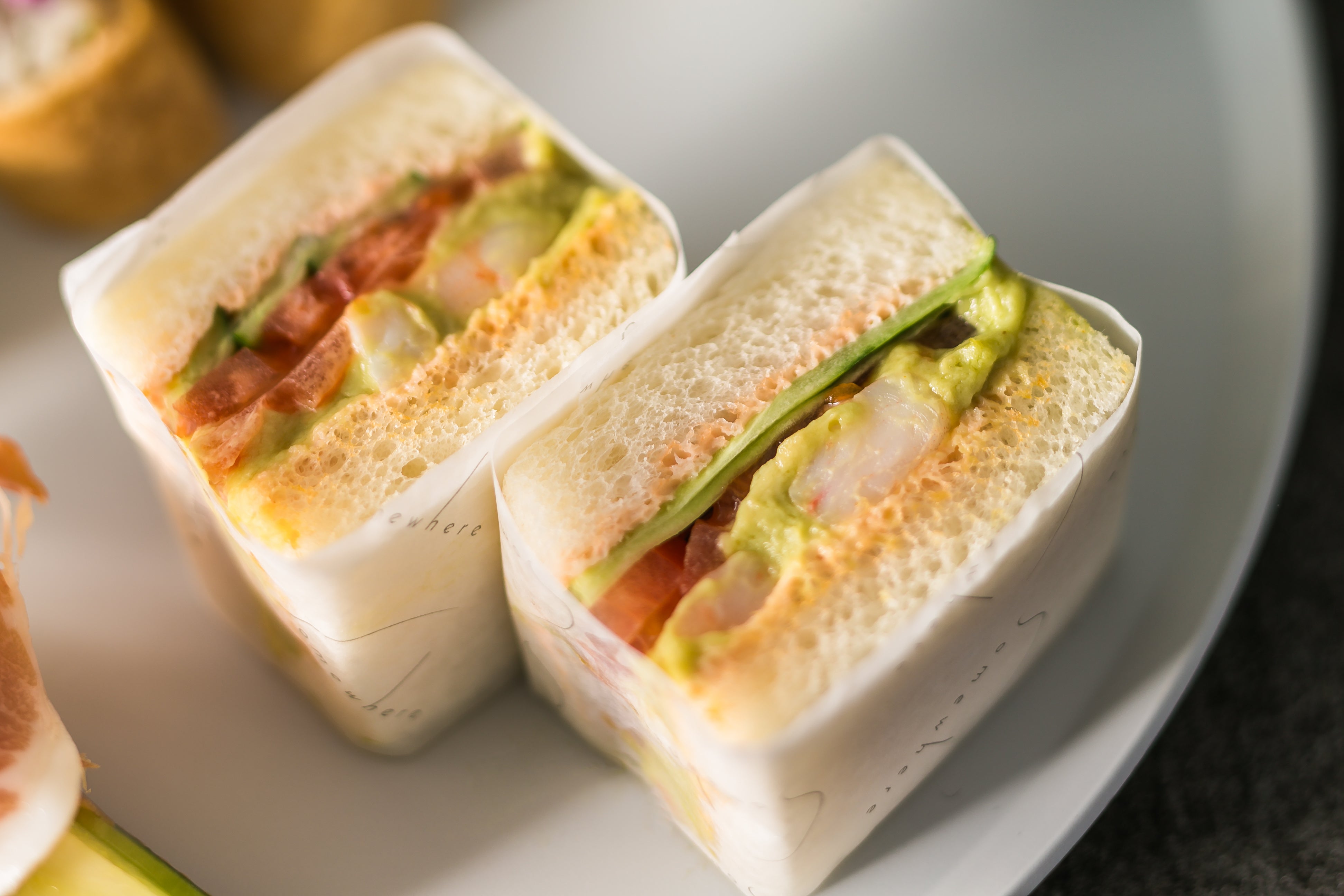 ボイルエビ、アボカド、キュウリをオーロラソースでサンドウィッチに。