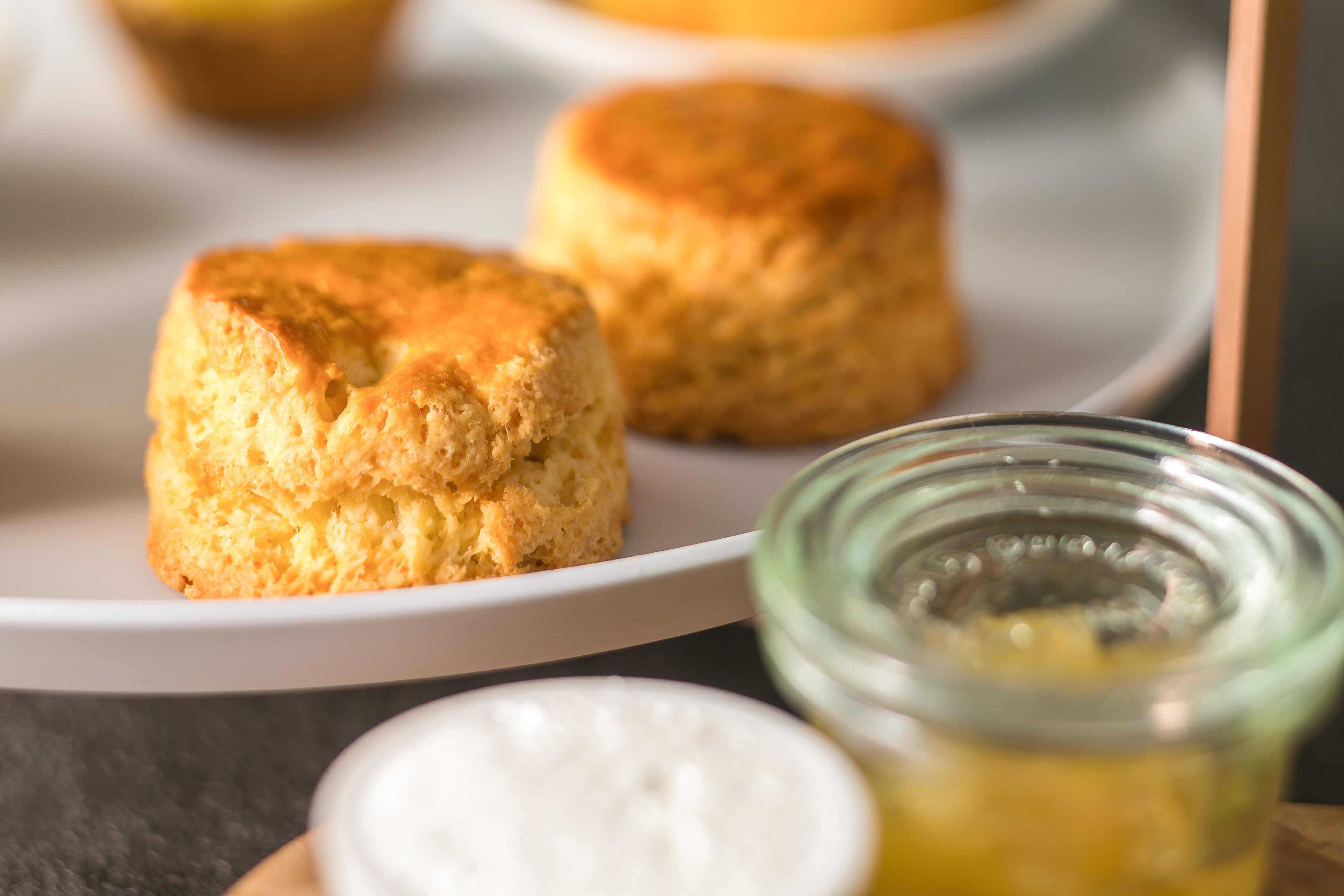 サクサクの自家製スコーンに酸味の効いたレモンコンフィチュールと軽やかなバター。