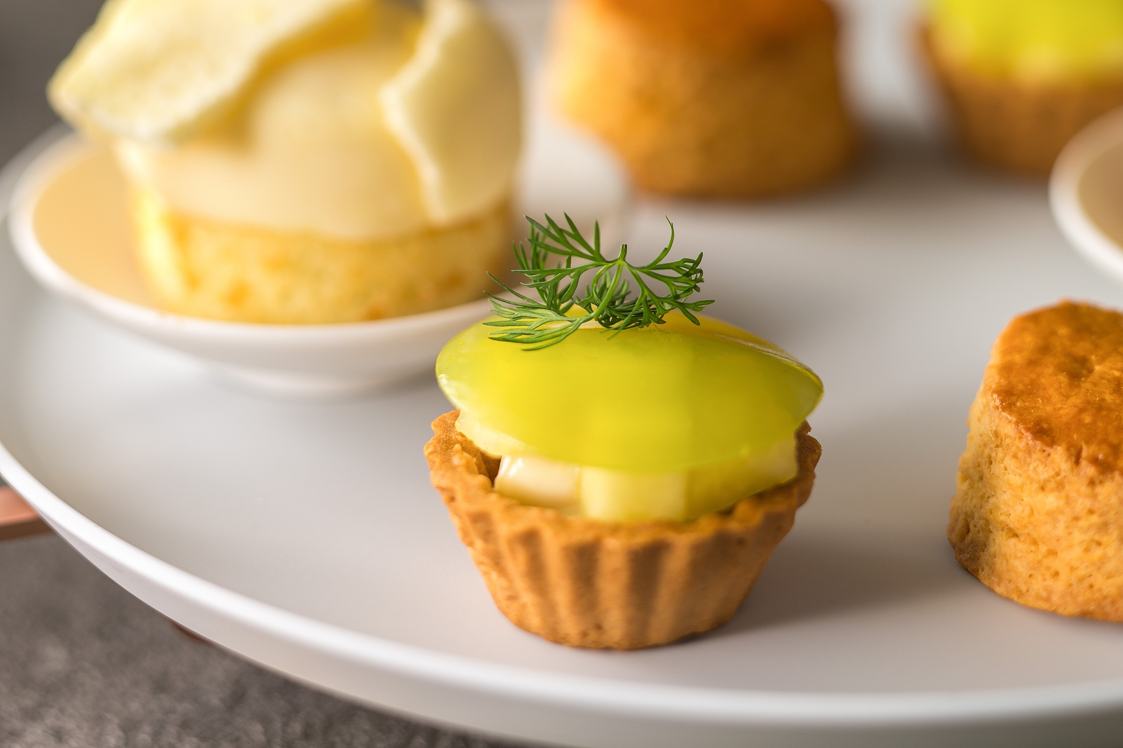 フレッシュメロンを九州産生乳の生クリームで包んだ「メロンのロールケーキ」、アプリコットのピュレを赤肉メロンのムースで包み、ビジュアルもメロンのイメージで仕上げた「メロンとアプリコットのムース」、カマンベールチーズ、フレッシュメロン、シート状のメロンピュレをタルト生地に乗せ、ディルの香りを添えた「カマンベールとメロンのタルト」など、メロンを使ったさまざまなスイーツとセイボリーが楽しめます。ドリンクは、フランスを代表するプレミアム・ティー・メゾン「KUSMI TEA(クスミティー)」をはじめ、コーヒーやカフェラテなどを飲み放題でご提供します。