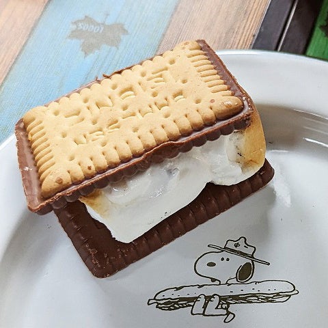 ビーグル・スカウトのキャンプの定番「スモア」作り。とろとろのこんがりしたマシュマロをチョコレート付きビスケットにはさんだ、あまーいスイーツ!