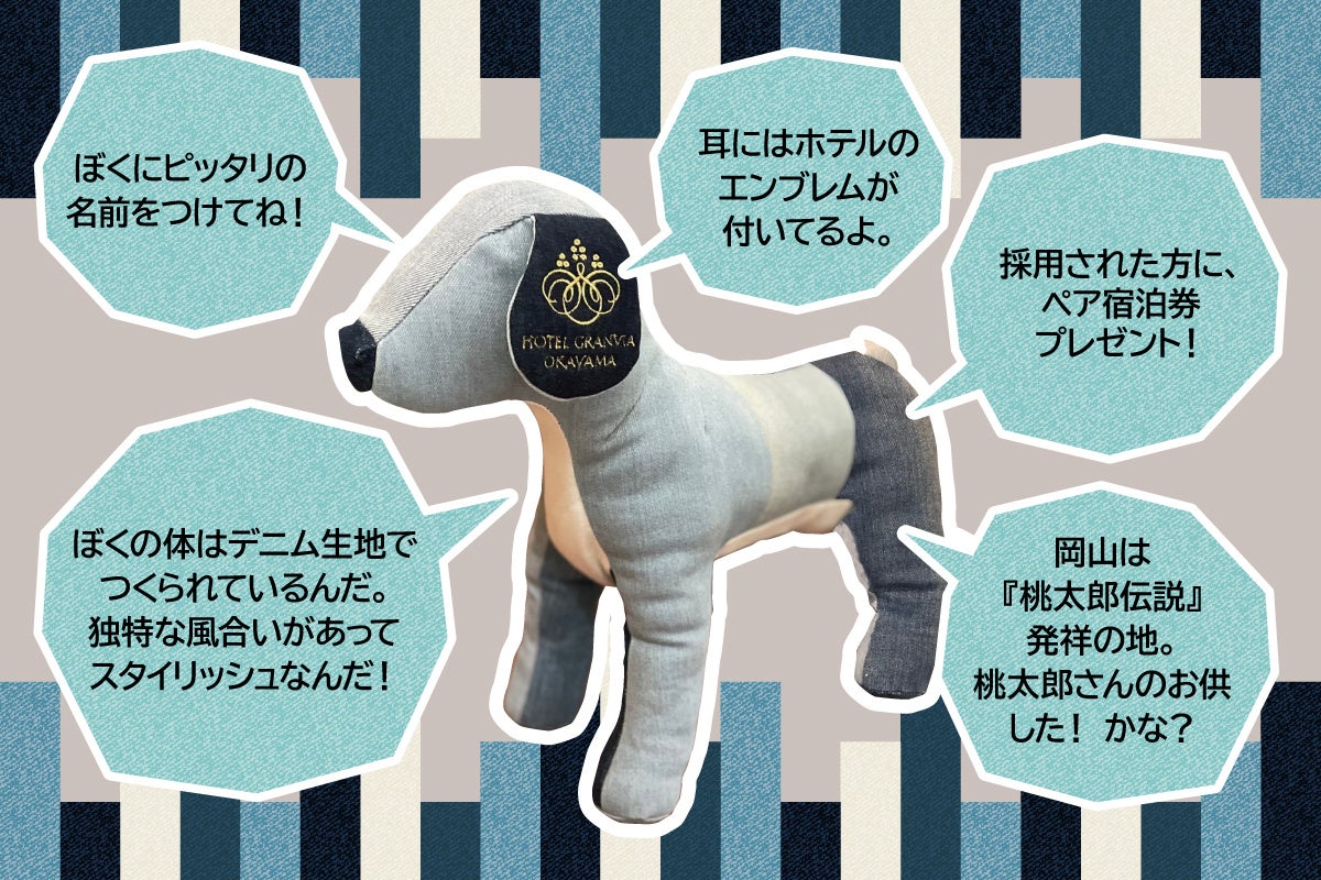 ホテルグランヴィア岡山(岡山市北区駅元町1-5、代表取締役社長:本井 誠)は、お客様に地域の文化を感じでいただくために、国産ジーンズ発祥の地と言われる岡山ならではのデニムの風合いで制作された、ホテルの特別なマスコット犬に名前をつけるネーミング募集キャンペーンを実施します。