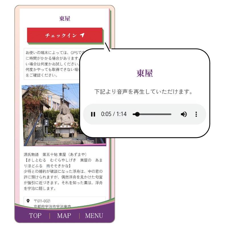 デジタルスタンプラリーがベースのシステムとなっており、対象スポットを巡り現地でGPS機能を使用してチェックインを行うことで、音声ガイドを再生できます。音声ガイドは声優の梶裕貴さんが光源氏役となって、各スポットについて解説しています。