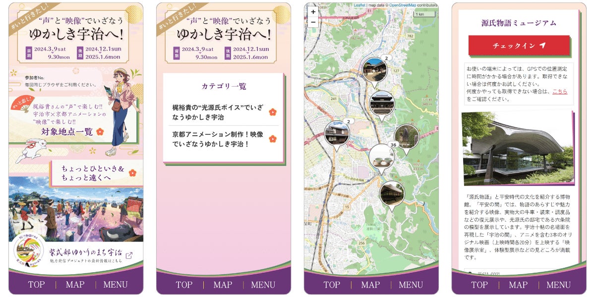 また、宇治市内で同様にチェックインを行うと、本プロジェクトのために京都アニメーションが制作したPR動画をお楽しみいただけます。