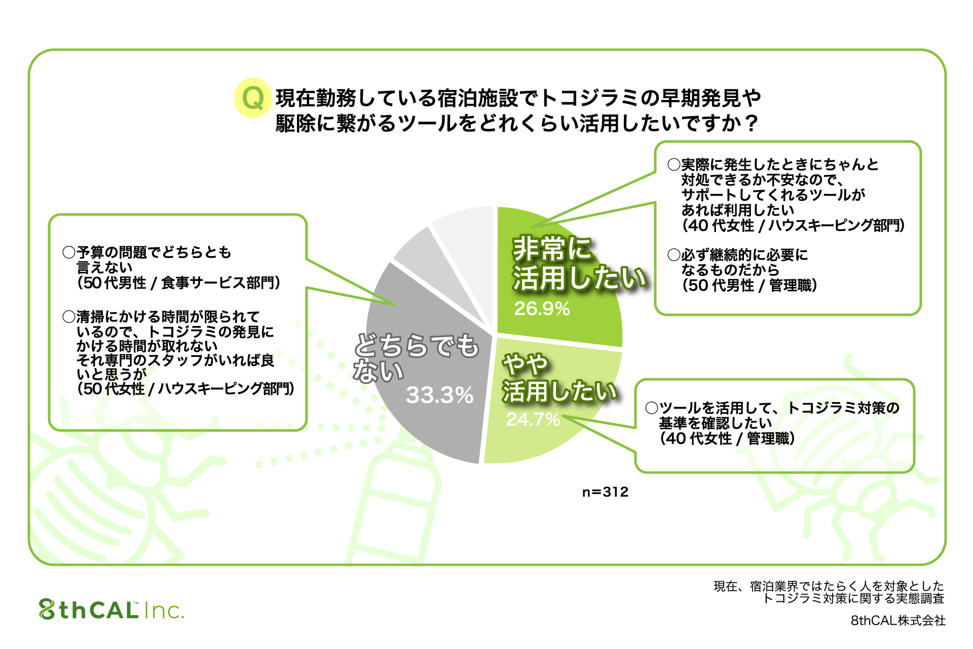 最後に「現在勤務している宿泊施設で、トコジラミの早期発見や駆除に繋がるツールをどれくらい活用したいですか?」といった質問を行ったところ、約半数が「活用したい」と回答しました。(「非常に活用したい(26.9%)」「やや活用したい(24.7%)」)