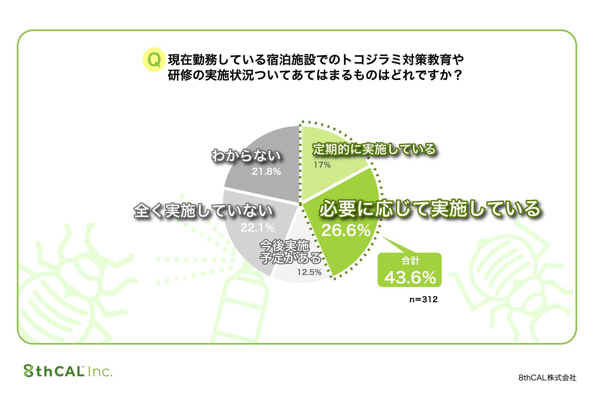 これまでの調査で、トコジラミに対する様々な課題が明らかとなりましたが、実際に「現在勤務している宿泊施設でのトコジラミ対策教育や研修の実施状況について」の調査を行ったところ、「実施している」と回答したのは43.6%という結果となりました。(「定期的に実施している(17%)」「必要に応じて実施している(26.6%)」)