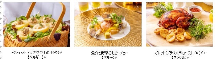 茸たっぷり和風パスタ 大葉と葱の香り(イタリア)/シーフードと野菜のシンガポール風 スープ仕立て(シンガポール)/サーモンのチャウダーソース(カナダ)/白身魚のオーブン焼き ピペラーダソース(スペイン)/肉団子の煮込み ムアンバ風(アフリカ)/ガレット〈ブラジル風ローストチキン〉(ブラジル)/ポークのトロトロ煮込み 赤味噌ソース(日本)/麻婆豆腐(中国)ほか
