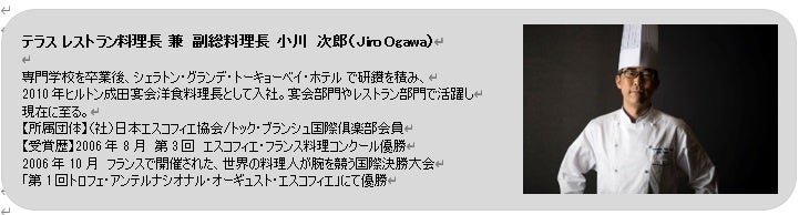シェフ、小川次郎がさまざまな国の料理をピックアップし、日本にはまだなじみのないメニュー、珍しいメニューを調べ、試行錯誤を重ね今回の「ワールドグルメビュッフェ」はスタートしました。お客様が驚くような顔を思い浮かべながら試作を行い、ビュッフェメニューの味のバランス、本場の味に近いインパクトのある味付けを目指し、日本人が食べやすいようアレンジを加えたお料理をご用意しております。オリジナル料理をそのまま再現するのではなく、調理方法や日ごろお目にかかれない見た目の美しさを追求した「ワールドグルメビュッフェ」は見逃せないメニューばかりです。