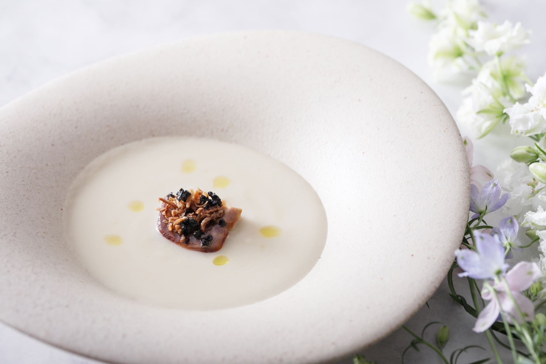愛知県産新玉葱とセロリラブのポタージュ フォアグラのソテーを浮かべて トリュフのアクセント