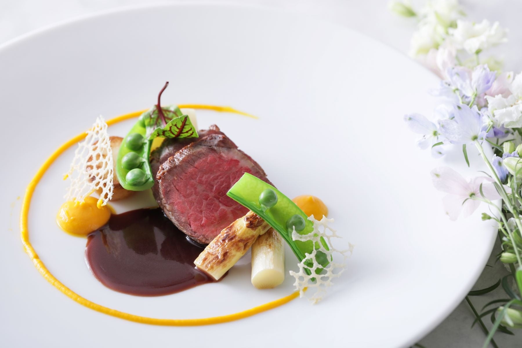 知多和牛「誉」のロティとホワイトアスパラガスのロースト 岐阜県産有機人参のピュレと赤ワインソースで