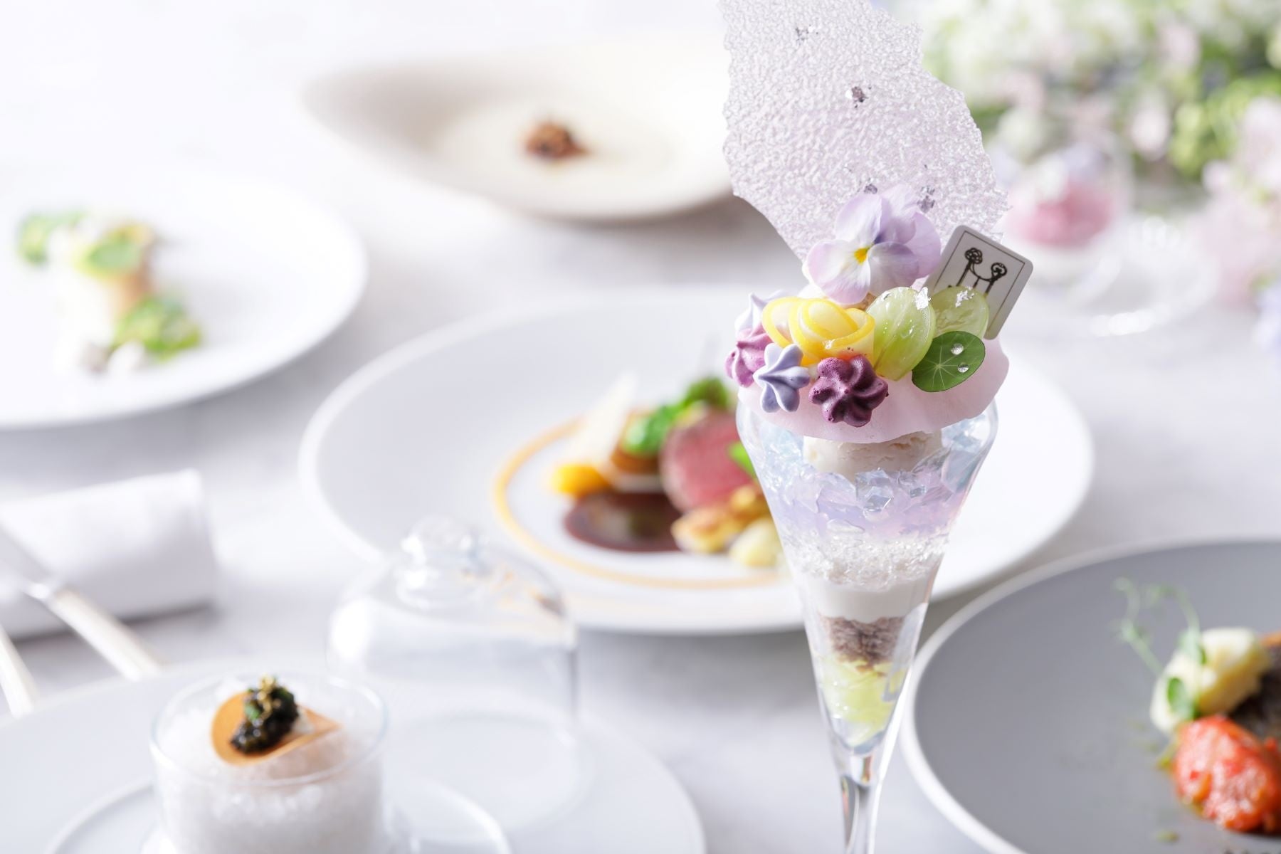また、コースデザートに関しては、紫陽花カラーが美しい「大人のご褒美パフェ~Azisai~」に変更(+990円 消費税込・サービス料15%別)も可能。完全プライベート個室や眺めの良いカーテン個室も完備しているので、記念日や女子会、家族のお祝いや接待など、様々な用途でご利用いただけます。