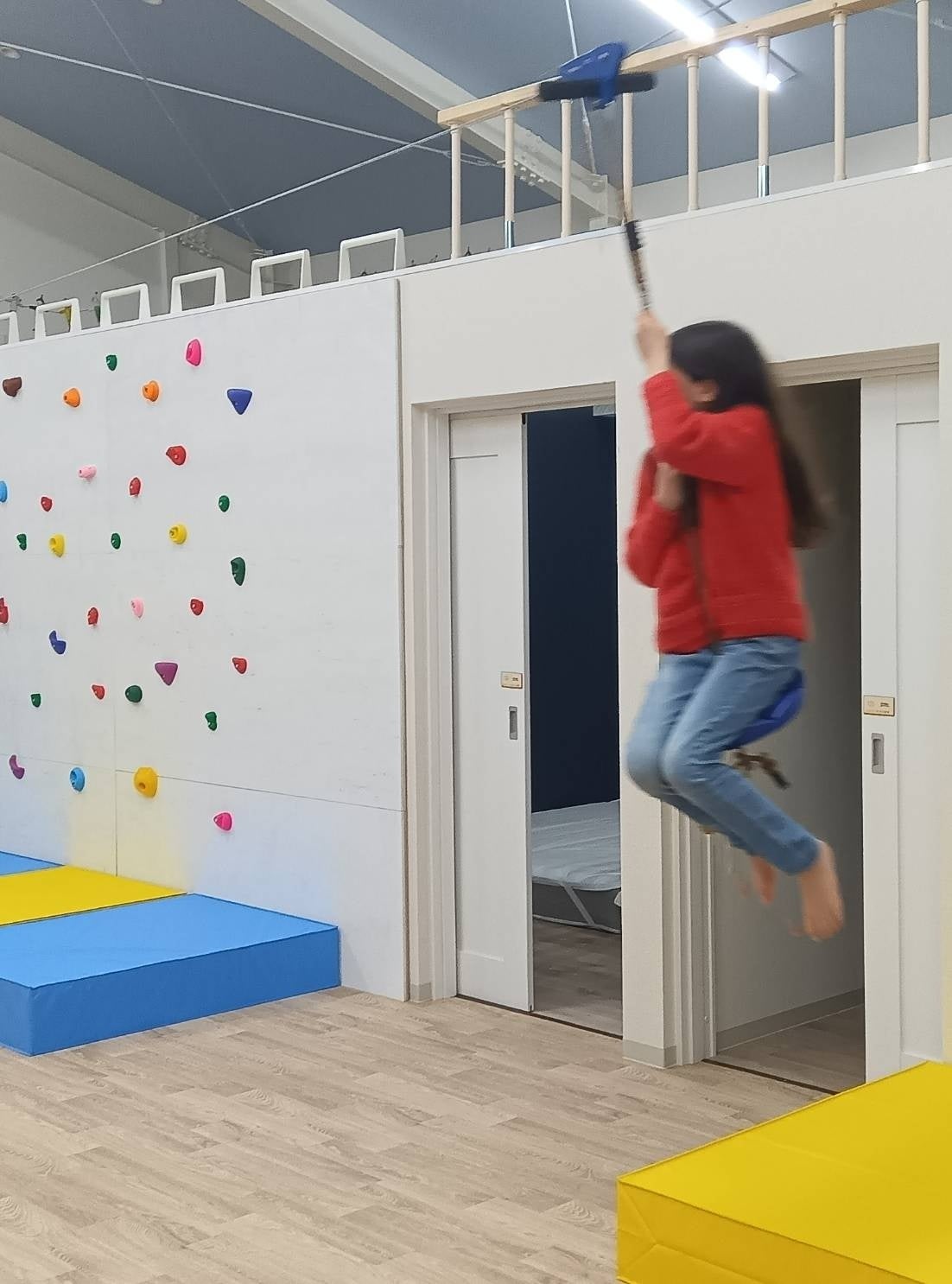 2Fには子供たちのためのアクティビティスペース。25畳を超える広大な室内スペースに、ジャングルジム・ボルダリング・ジップライン・吹き抜けネットなど、子供が楽しめるしかけがたくさん。