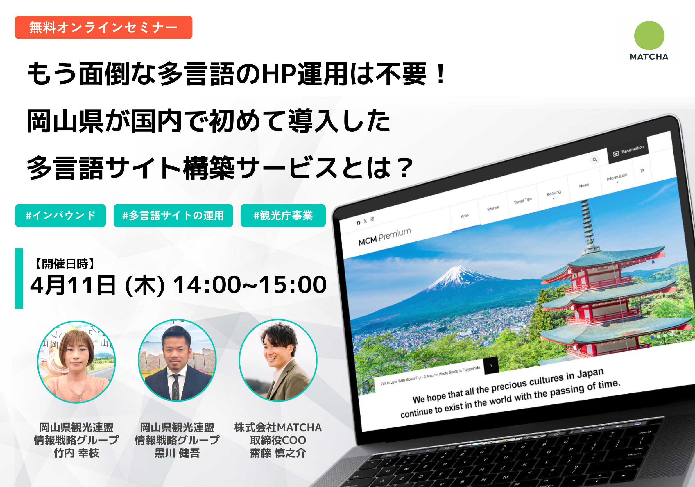 インバウンドメディアを運営する株式会社MATCHAが開発した多言語対応のホームページ構築サービスの活用について国内で初導入した岡山県観光連盟をお迎えしオンラインセミナーを開催します