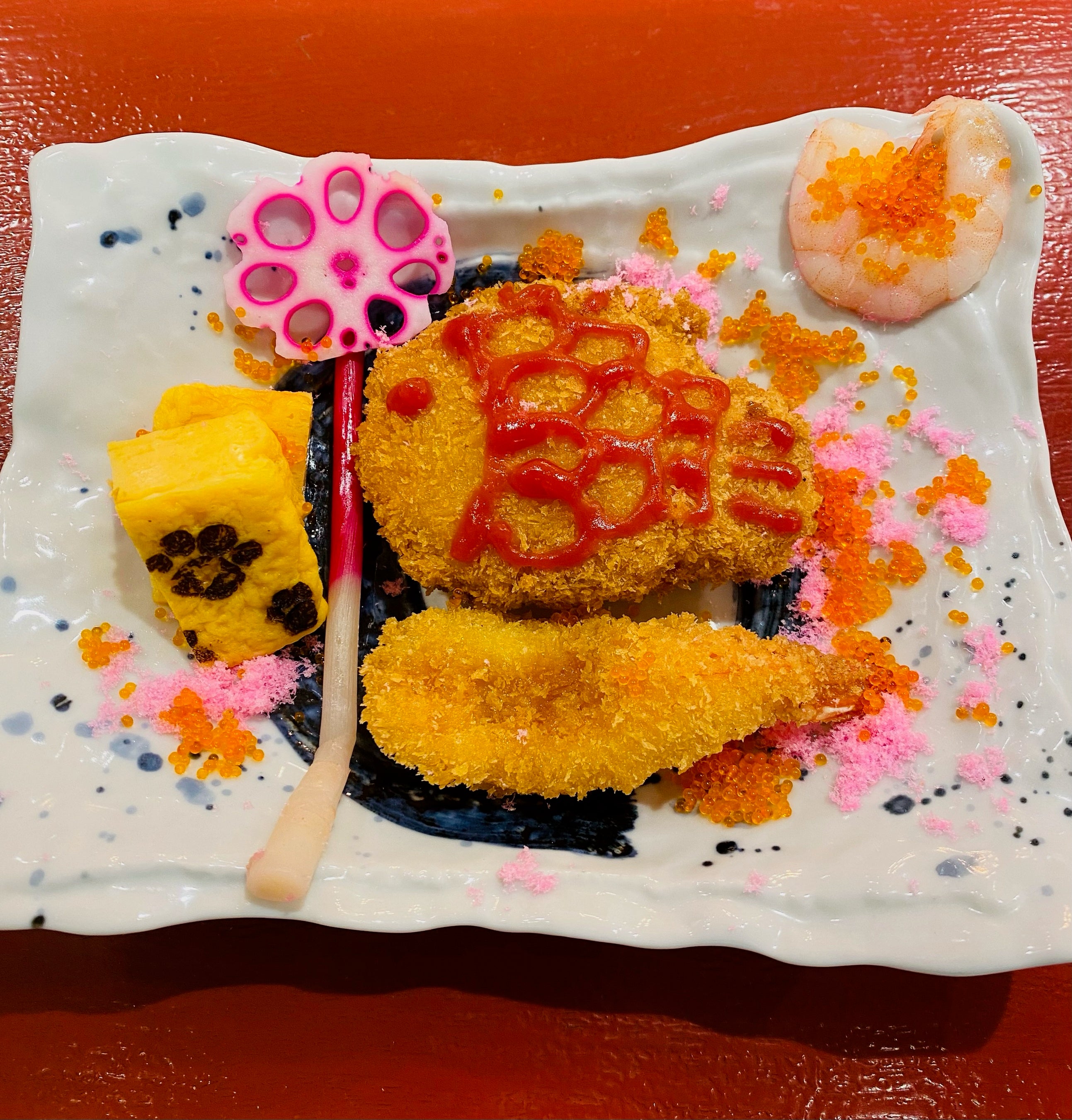 人気の料理 えびフライ、から揚げ、ハンバーグやパンダのごはん、お野菜のお寿司、デザート、オレンジジュース付きと豪華御膳!