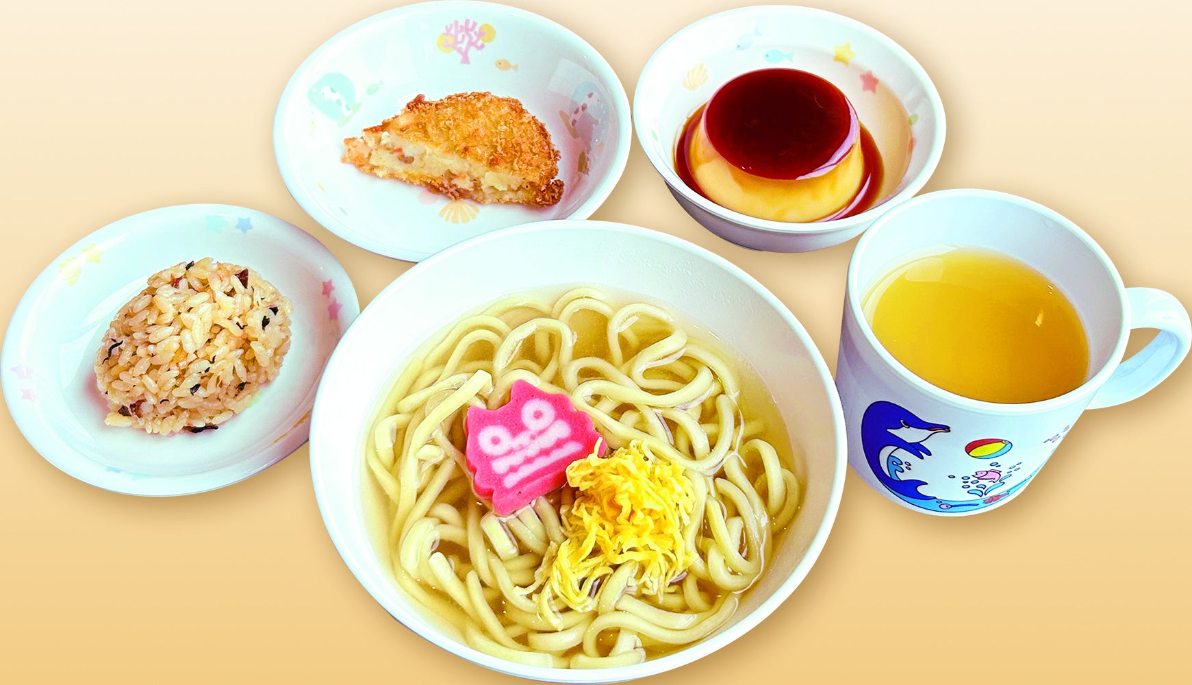 かわいいシーサーかまぼこを乗せたお子様そばです。りんごジュースやデザートも付いてます。